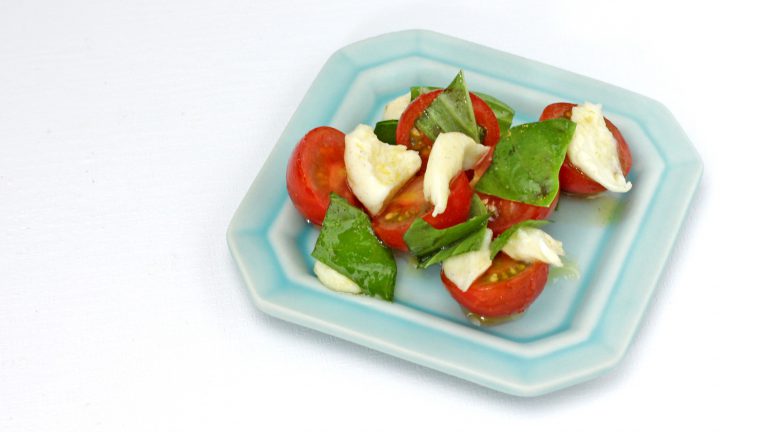 トマトとチーズをオリーブオイルベースのドレッシングであえました。オリーブオイルとバジルを入れることで風味がアップし、少ない塩分でもしっかりした味付けに仕上がります。