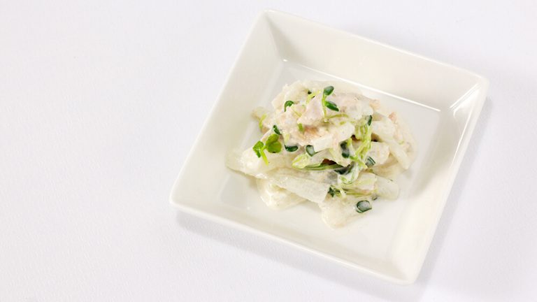 マヨネーズは塩分控えめでエネルギーが確保できる調味料のため、腎臓病食の強い味方!大根はしっかりと水気を切ってから和えるのがポイントです。