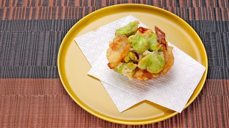 そら豆やほたて、ネギを活用したかき揚げです。ねぎを入れることで甘味がアップ!「ほたて」を使うことで、簡単にたんぱく質制限ができます。揚げ物料理で手軽にカロリーアップ!