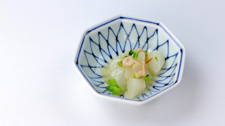 冬が旬のかぶを使用し、コンソメとバターの風味をきかせた一品です。ベーコンを入れることで旨味が増すため、減塩にもつながります!野菜は茹でることでカリウムを控えることが出来ます。