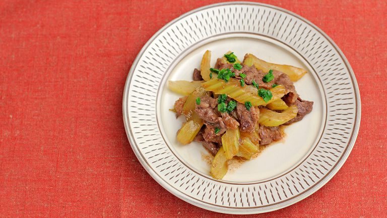 セロリと牛バラ肉を炒め、オイスターソースで味付けしました。ごま油をプラスすることで風味がアップ!減塩でもしっかりとした味わいになりますよ。