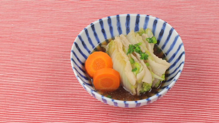 レンジで簡単に作れる重ね蒸しは、忙しい日にも嬉しい和食の主菜です。ジューシーな豚バラ肉と甘みを増した白菜が層になり、ごま油の香ばしさと鶏ガラスープのコクがさらに旨味を引き立てます。食べ応え十分で、心も体も温まる満足感のある一品です。