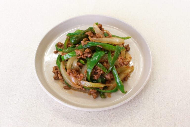 ひき肉と彩り豊かなピーマン、玉ねぎを、甘酸っぱいケチャップで炒め合わせた洋風の主菜です。彩りもよく、しっかりとした味付けなので、ご飯と相性の良い食欲そそる一品です。