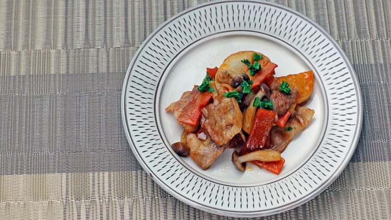 カレー粉で香ばしく炒めた豚肉とえのき、玉ねぎの主菜です。食欲を刺激するカレー粉とブラックペッパーの香りに、ごま油のコクが溶け込み、豊かな風味と旨みが口いっぱいに広がります。簡単なのに、ごはんがすすむ、食べ応え満点の一品です。