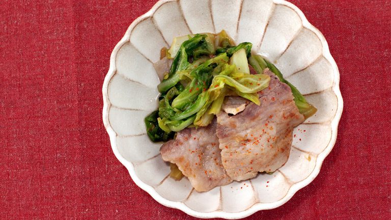 レンジで簡単に作れる重ね蒸しは、忙しい日にも嬉しい和食の主菜です。ジューシーな豚バラ肉と甘みを増した白菜が層になり、ごま油の香ばしさと鶏ガラスープのコクがさらに旨味を引き立てます。食べ応え十分で、心も体も温まる満足感のある一品です。