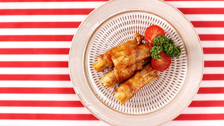 薄切りの豚肉でもきのこに巻けばボリュームアップします!シャキシャキとした食感のえのきたけを使うことにより、歯ごたえの楽しい一品となりました。ご飯に合う照り焼き味にしたので、食欲も湧いてきますよ。脂身の多めな豚ばら肉をあえて使うことで、カロリーをしっかり摂ることができます。片栗粉をつけてから焼くことで、表面によくタレが絡み、少ない塩分量でもしっかり味を感じられますよ。